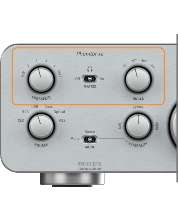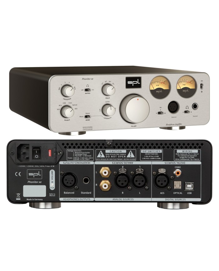 L'amplificatore per cuffie dedicato Phonitor XE-DAC è il prodotto flagship dell'azienda tedesca SPL che si pone di raggiungere gli stessi obiettivi riconosciuti in tutto il mondo nel campo pro anche in quello domestico e questo ampli che si differenzia dalla versione X in quanto svolge solo il compito di amplificatore cuffie, è un oggetto che può realmente soddisfare anche i più esigenti del settore. Esso si presenta in un cabinet molto solido e vede la presenza sul frontale di due Vu-meter che visualizzano i livelli di ingresso per il canale audio sinistro e destro oltre a dare un tocco retrò, il grande controllo del volume da 45 mm fresato dal pieno e motorizzato Alps RK27 “Big Blue” che esalta ulteriormente la sensazione di solidità. Sono presenti poi le connessioni per una cuffia standard con una presa jack stereo da 6,3mm e per cuffie bilanciate che utilizzano un jack XLR a 4 poli, particolare il fatto che queste sono replicate anche sul retro in modo da poter usare due cuffie contemporaneamente ma non una bilanciata e sbilanciata contemporaneamente. Al Phonitor XE-DAC possono essere collegate fino a sei sorgenti attraverso gli ingressi XLR, RCA, USB, Coax, Optical e AES/EBU. La SPL è sempre fiera di ricordare che i suoi prodotti si basano sulla tecnologia VOLTAiR, che fornisce un vantaggio in termini di dinamica e headroom e garantiscono una potenza maggiore tale da poter collegare a esso anche le cuffie più ostiche e assetate di corrente. In questo rivoluzionario amplificatore è presente la funzionalità "Phonitor Matrix" grazie alla quale è possibile ascoltare la musica tramite le cuffie come se si stesse ascoltando tramite gli altoparlanti, rendendo l'ascolto più realistico e coinvolgente e meno affaticante. L'altra funzione molto importante è quella del controllo della lateralità, perchè visto che la capacità uditiva può essere differente da un orecchio all'altro, particolarmente evidente quando si ascolta con le cuffie, attraverso questo controllo si può compensare ciò con regolazioni di fino facendo passare più segnale dalla parte dell'orecchio più 'debole'. Nella versione XE-DAC il Phonitor è fornito con un chip DAC AKM AK4490 Velvet Sound premium, che grazie alla sua nuova architettura riproduce i dettagli sonori più fini e converte l'audio PCM con una risoluzione di 32 bit e una frequenza di campionamento fino a 768kHz, che equivale a 16 volte la risoluzione del CD, è inoltre supportato il DSD fino a una risoluzione di DSD256.