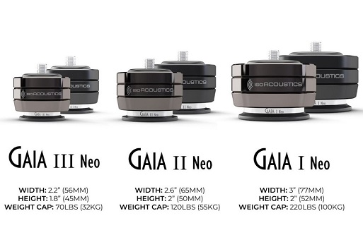 La serie IsoAcoustics GAIA è articolata su tre modelli, ognuno progettato per gestire carichi e masse differenti. Abbiamo i GAIA III, pensato per diffusori compatti e bookshelf per un peso totale fino a 32 kg per ciascun diffusore, i GAIA II per diffusori da pavimento di medie dimensioni per un peso fino a 55 kg, ed infine i GAIA I dedicato a sistemi di grandi dimensioni e peso elevato visto che un set può gestire un peso fino a 100 kg.