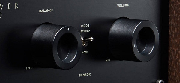 Tra queste manopole rotanti ci sono due interruttori a pollice che consentono di abbassare le luci da una parte e un interruttore tra mono e stereo dall'altra, una bella opzione per coloro che ascoltano ancora registrazioni mono degli anni '50 e '60, mentre sulla sinistra è posizionato il pulsante di accensione dell'amplificatore.