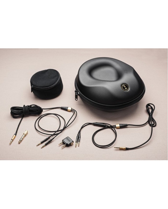 La lussuosa confezione include un ricco set di accessori forniti in dotazione, tra cui un adattatore da mini jack a jack, un adattatore per aereo (dual mono), un sacchetto per riporre cavi ed accessori ed una custodia semi-rigida in cui poter riporre le cuffie e gli stessi accessori dopo l’ascolto.