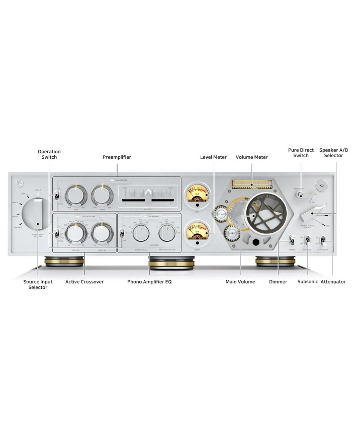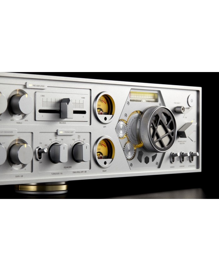 Amplificatore in classe AD con 4 moduli amplificatori mono e possibilità di ponte stereo, Potenza 2x400 W o 4x200 W a 4 e 8 ohm, Potenziometro del volume orientato, Frequenza di crossover variabile in modalità bi-amplificazione, Regolazione toni e bilanciamento, Misuratori del livello dell'ago, Modalità Pure Direct, Ingresso analogico XLR e 3x RCA, Preamplificatore phono MM/MC, Uscita subwoofer, Telecomando