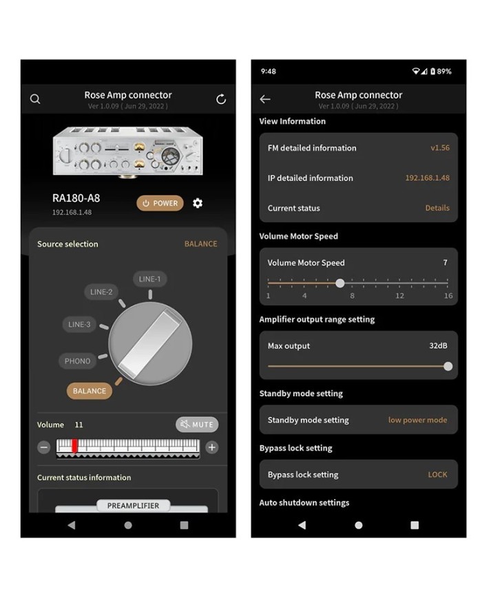 Per finire con l'RA180 viene fornito un semplice telecomando in alluminio che controlla le funzioni di base più importanti dell'amplificatore, è comunque prevista l'app complementare "Rose Amp", la quale ospita esattamente le stesse funzionalità del telecomando fisico dell'RA180 e fornisce anche alcune ulteriori opzioni di gestione come la velocità del motore del volume, il guadagno massimo dell'amplificatore (fino a 32 dB), le impostazioni di standby e spegnimento automatico, la funzionalità di blocco/sblocco per la modalità di bypass dell'amplificatore di potenza, oltre a mostrare anche su cosa sono impostati ciascuno dei moduli dell'amplificatore.
