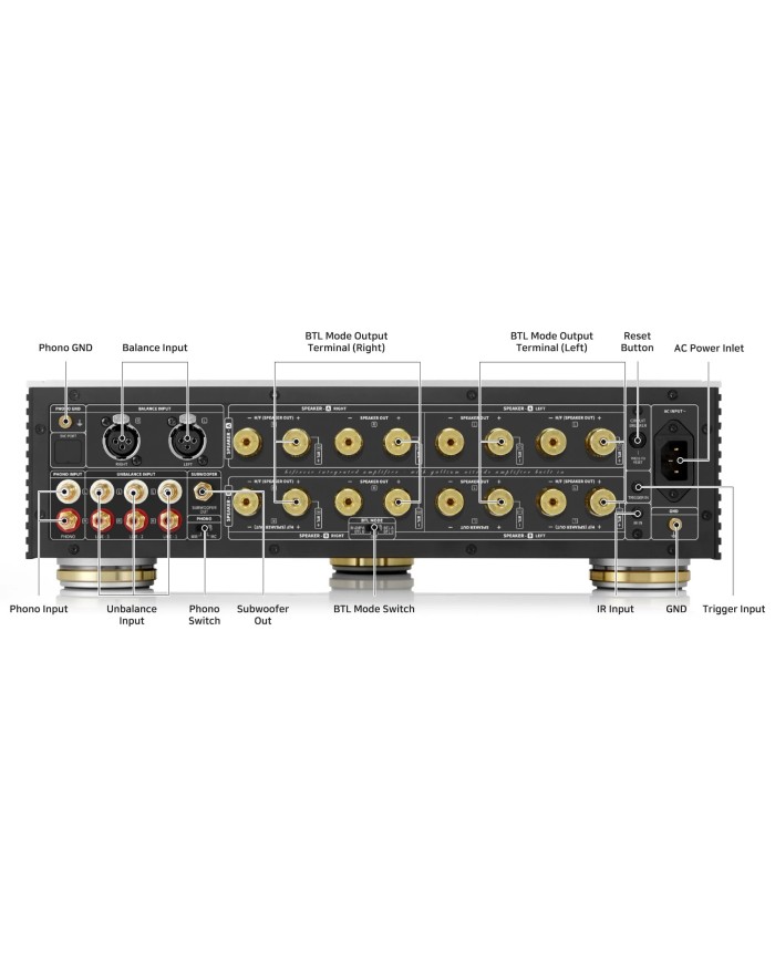 Grazie poi ai suoi 3 ingressi RCA, un ingresso XLR, oltre a un ingresso phono compatibile MM e MC, è possibile collegare ad esso qualsiasi tipo di sorgente, mentre un'uscita subwoofer permette il collegamento in modo molto pratico e veloce di un subwoofer.
