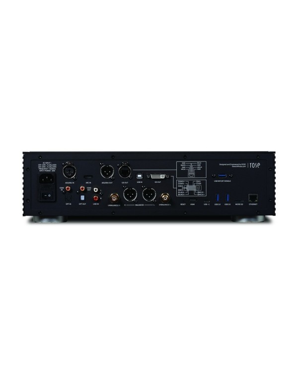 Rose RS151, Network streamer e DAC ad alte prestazioni progettato per offrire un’esperienza audio di livello superiore, DAC ES9039PRO, Modulo ROSE DPC con clock Femto per una precisione estrema, Supporta fino a DSD512 nativo, PCM 32-bit/768kHz e MQA, Uscite XLR e RCA, HDMI eARC, HDMI 4K con passthrough multi-canale, CPU a 8 core, 8GB di RAM e 32GB di memoria interna per prestazioni più veloci, Connettività Wi-Fi e Ethernet, Compatibilità con Apple Music, Spotify, Tidal, Qobuz, ROON Ready e Radio Internet, Alimentazione con trasformatore toroidale lineare, Chassis in alluminio per ridurre vibrazioni e rumore, Interfaccia utente intuitiva grazie all'ampio display Full HD da 15.4”, Possibilità di ripping e riproduzione diretta con drive esterno opzionale, Telecomando, Finitura Nero