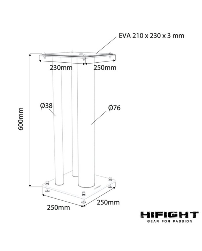 L’altezza è di 60 cm, punte escluse. Con le punte si raggiunge un'altezza di ulteriori 30 mm (regolabili in continuo). La piastra inferiore è quadrata e misura 250 mm di lato. Le basi superiori misurano 250 mm frontali per 230 mm di profondità. Il peso della coppia di stativi è di 16.5 Kg.